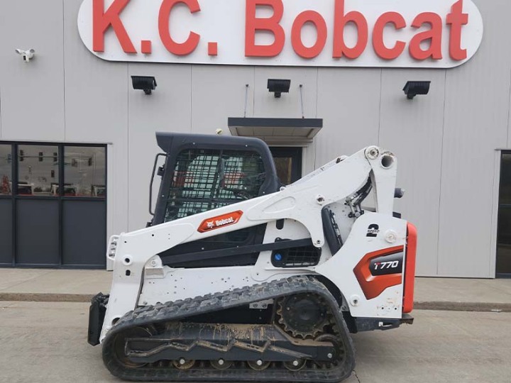 The 2023 Bobcat T770 compact track loader is a versatile machine delivering the performance you need for big projects. With a 92-hp engine, it meets Tier 4 standards without a Diesel Particulate Filter, reducing maintenance time. It has a rated operating capacity of 3,475 lbs and industry-leading breakout forces. The T770 is designed with a durable undercarriage and superior lift arms. It has a maximum lift height of 131 inches, making it ideal for loading trucks and hoppers. Features include optional joystick control, optional Heat, and standard backup alarm. The machine has a high flow option and a standard auxiliary hydraulics. It also has a quick attach system for attachments.